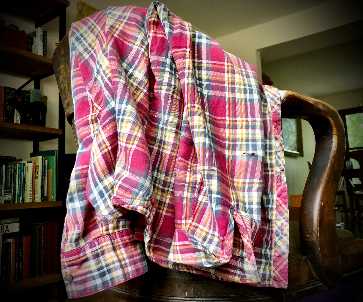 I noticed a hole had worn through my flannel shirt at the elbow when I put it on today. The paper thin material had finally gave way and it filled me with dread. This old flannel was there with me the night my husband died, covering me when I turned off the machines and said good bye.